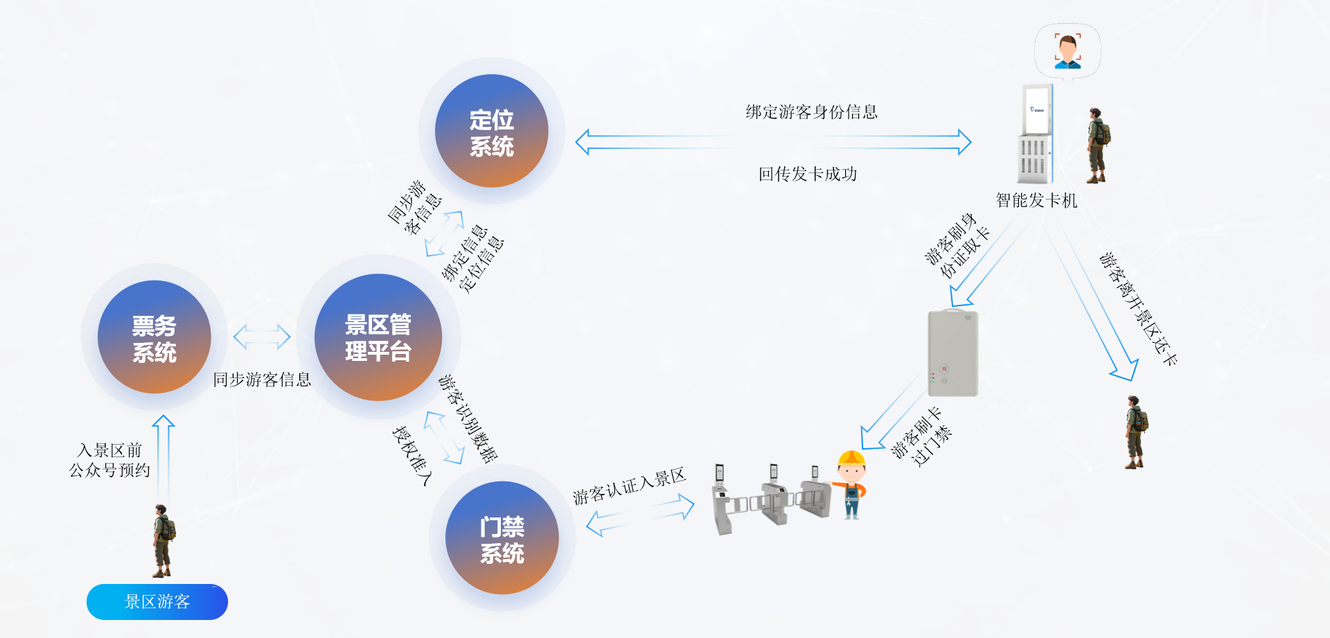 在景區(qū)安全管理方面,新銳科創(chuàng)北斗定位卡可以聯(lián)動發(fā)卡機(jī)、定位系統(tǒng)、門禁系統(tǒng)、票務(wù)系統(tǒng)、景區(qū)管理平臺,構(gòu)建景區(qū)完整的智慧化管理閉環(huán)。各系統(tǒng)間高度協(xié)同,確保了從游客預(yù)約、取卡、刷卡過門禁、進(jìn)入景區(qū)打卡到離開景區(qū)的全流程數(shù)據(jù)無縫流轉(zhuǎn)。以下是景區(qū)系統(tǒng)聯(lián)動方案圖: