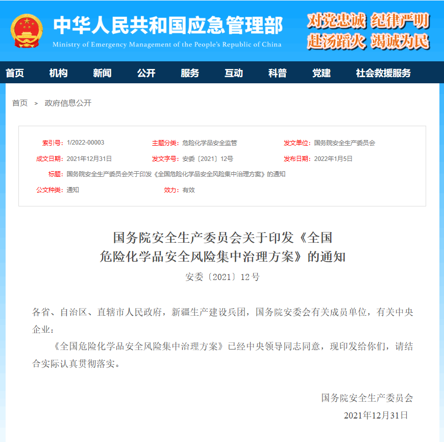 2022年1月5日,國務(wù)院安全生產(chǎn)委員會發(fā)布關(guān)于印發(fā)《全國危險化學(xué)品安全風(fēng)險集中治理方案》的通知(安委〔2021〕12號)。