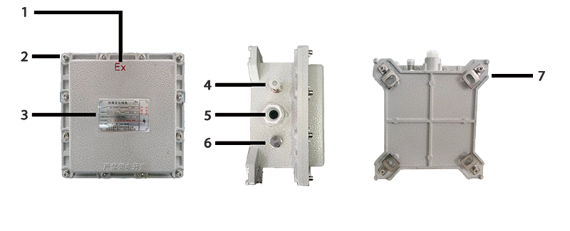 1.防爆標(biāo)識 2.固定孔 3.銘牌標(biāo)示 4.LoRa天線接頭 5.電源線、網(wǎng)線出線孔 6.4G/5G天線接頭 7.設(shè)備固定孔