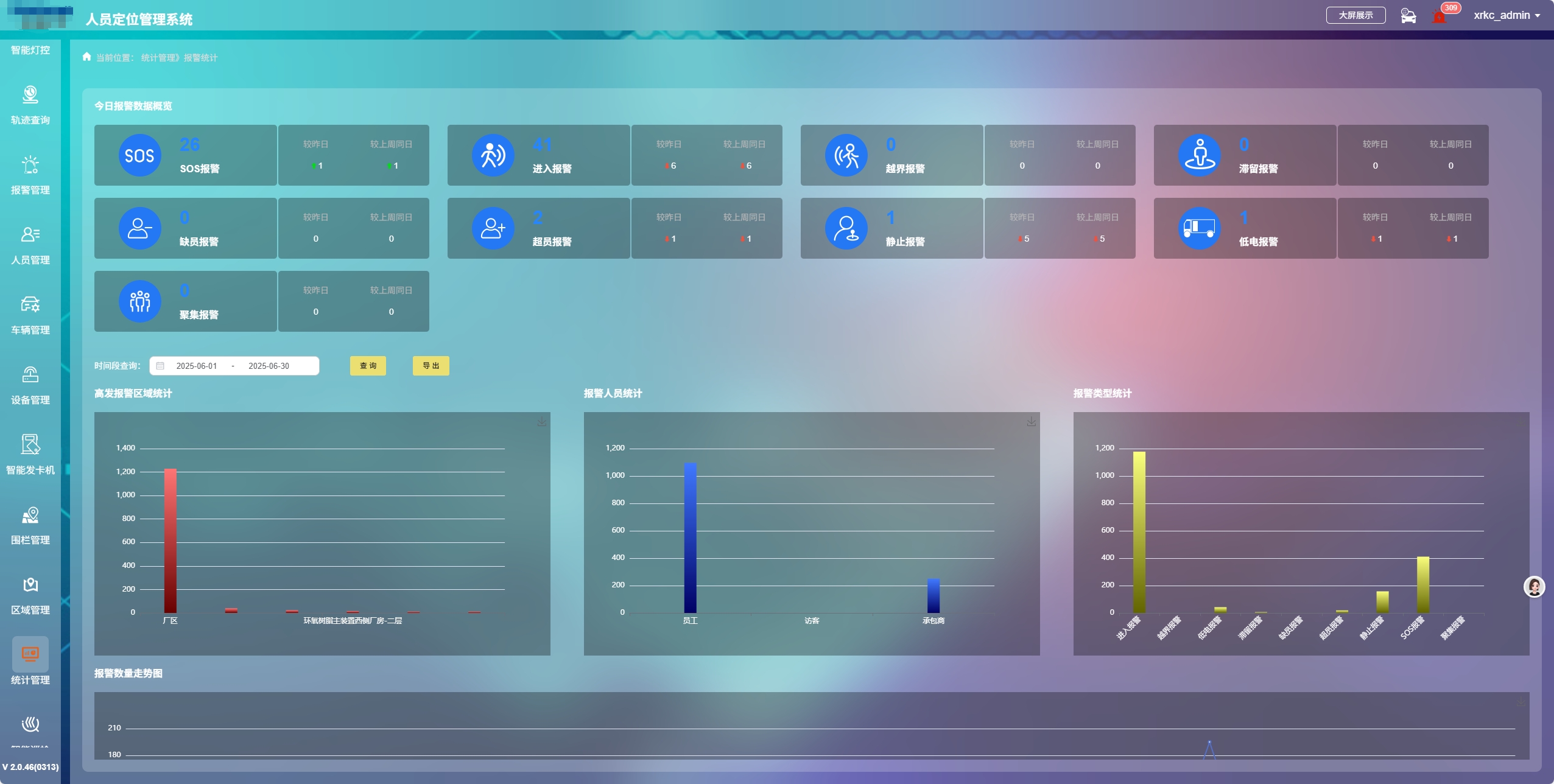支持各類數(shù)據(jù)的實(shí)時(shí)統(tǒng)計(jì)分析,提供全面的數(shù)據(jù)報(bào)表和可視化工具,以圖表形式展示各區(qū)域人員分布及報(bào)警信息等關(guān)鍵數(shù)據(jù)。