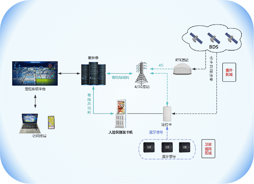 在礦區(qū)地勢(shì)較高處部署RTK差分基站,基站接收北斗/GPS衛(wèi)星信號(hào)后,通過(guò)4G網(wǎng)絡(luò)將差分?jǐn)?shù)據(jù)實(shí)時(shí)傳給定位終端。定位終端結(jié)合原始衛(wèi)星信號(hào)與差分修正數(shù)據(jù),提升定位精度。針對(duì)礦區(qū)山體遮擋問(wèn)題,采用多個(gè)基站分布式部署,確保信號(hào)連續(xù)覆蓋。