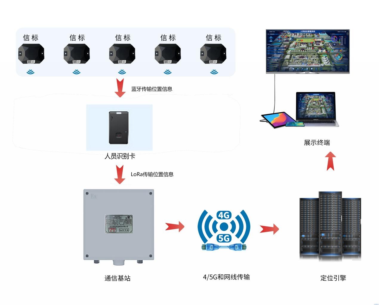 室內(nèi)采用藍(lán)牙+LoRa定位系統(tǒng),該系統(tǒng)由藍(lán)牙信標(biāo)、定位標(biāo)簽、定位基站、定位引擎、展示終端組成。藍(lán)牙信標(biāo)以藍(lán)牙方式周期性發(fā)送帶自身特征碼的廣播信號,為人員定位提供參考位置信息;人員隨身攜帶內(nèi)嵌藍(lán)牙和LoRa通訊模塊的定位標(biāo)簽接收藍(lán)牙信標(biāo)發(fā)送的位置信息,并通過LoRa無線網(wǎng)絡(luò)將數(shù)據(jù)傳輸?shù)交?;基站收集定位?biāo)簽發(fā)送的位置數(shù)據(jù),并將數(shù)據(jù)通過4G/5G或網(wǎng)線傳輸給定位引擎;定位引擎通過定位算法將接收到的位置數(shù)據(jù)解算為具體的地理位置,并與電子地圖引擎進(jìn)行信息處理后,在展示終端展現(xiàn)人員位置。