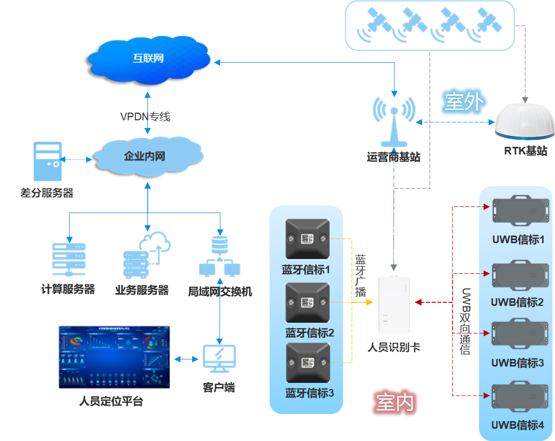 新銳科創(chuàng)基于多模融合定位技術(shù),自主研發(fā)了4G+藍(lán)牙+UWB+GPS/北斗RTK融合定位系統(tǒng),該系統(tǒng)以衛(wèi)星為主要定位手段,利用RTK差分定位技術(shù)提升衛(wèi)星定位精度,利用藍(lán)牙或UWB來(lái)輔助衛(wèi)星定位,彌補(bǔ)衛(wèi)星信號(hào)在某些區(qū)域覆蓋的不足,保障衛(wèi)星信號(hào)較弱區(qū)域的定位精度,從而實(shí)現(xiàn)室外全場(chǎng)景覆蓋的高精度定位。系統(tǒng)拓?fù)鋱D如下: