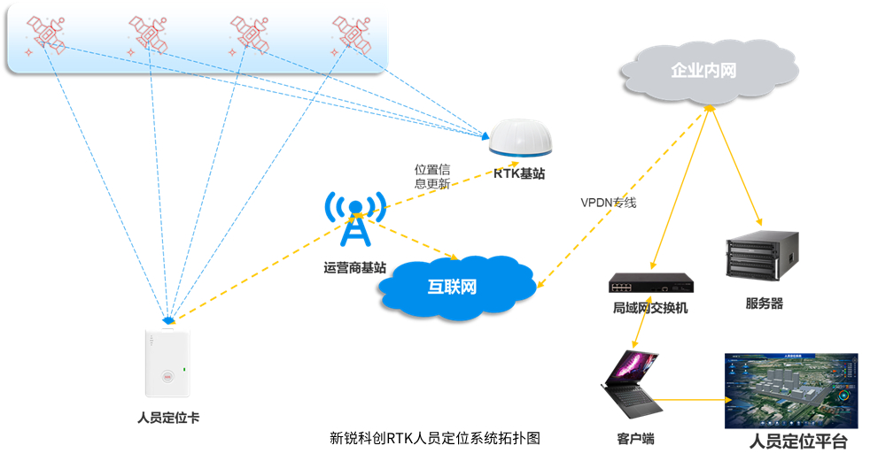上圖是新銳科創(chuàng)自主研發(fā)的GPS/北斗RTK差分人員定位系統(tǒng),系統(tǒng)主要由衛(wèi)星、人員定位識(shí)別卡、RTK差分基站、服務(wù)器構(gòu)成。RTK差分基站接收衛(wèi)星信號(hào),解算出差分信息后通過(guò)4G網(wǎng)絡(luò)上報(bào)給服務(wù)器(企業(yè)內(nèi)網(wǎng)部署),服務(wù)器實(shí)時(shí)刷新最新的差分信息;人員定位識(shí)別卡接收衛(wèi)星信號(hào),通過(guò)4G網(wǎng)絡(luò)連接服務(wù)器,獲取最新的差分信息,從而解算出高精度經(jīng)緯度位置信息后,再通過(guò)4G網(wǎng)絡(luò)將位置信息上傳到服務(wù)器,更新卡片位置信息。