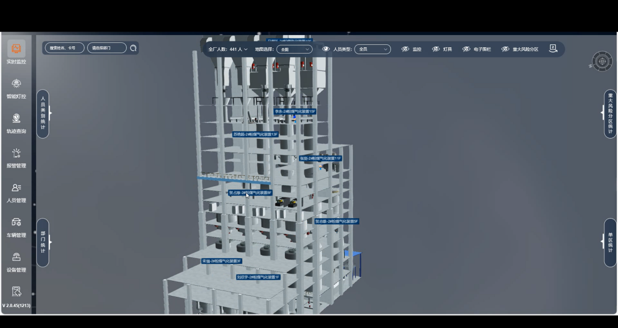 系統(tǒng)支持在工廠2D/3D電子地圖上實(shí)時(shí)顯示人員位置分布,可分樓層、分車(chē)間顯示;可對(duì)每個(gè)人的實(shí)時(shí)軌跡進(jìn)行跟蹤,實(shí)現(xiàn)了對(duì)人員位置的實(shí)時(shí)追蹤和展示。