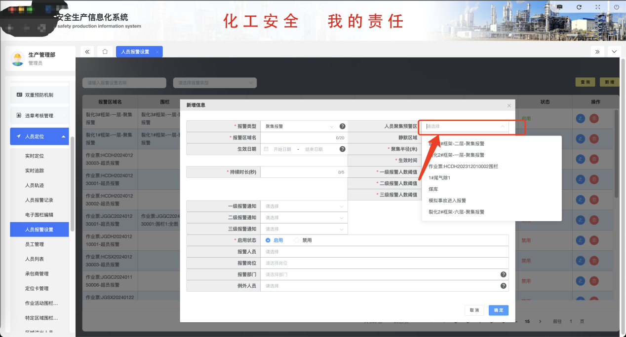 系統(tǒng)支持在廠區(qū)自定義設(shè)置電子圍欄范圍,設(shè)定圍欄生效時(shí)間、限定人數(shù),通過(guò)設(shè)定區(qū)域的進(jìn)入權(quán)限管理規(guī)則,系統(tǒng)能夠確保人員只在安全范圍內(nèi)活動(dòng),有效防止了違規(guī)進(jìn)入危險(xiǎn)區(qū)域的行為。