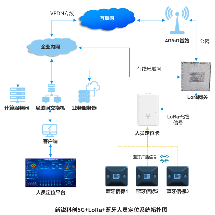 5G+LoRa+藍牙人員定位系統(tǒng)網(wǎng)絡(luò)拓?fù)鋱D如下: